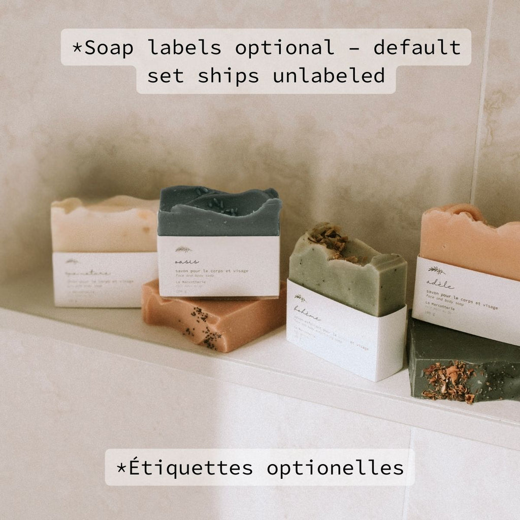 If you prefer each soap to come individually wrapped and labeled (ideal for gifting separately), simply select the “With Labels” option above.