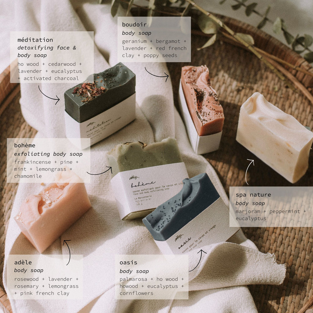 At La Marcotterie, we craft luxurious, one-of-a-kind blends by pairing well-loved classic essential oils with sophisticated, rarely seen in soap making essential oils, creating an intriguing and elevated sensory shower experience. Each bar is handcrafted with delicate pastel hues, minimalist waves, and dried botanicals, transforming everyday cleansing into an artful self-care ritual.